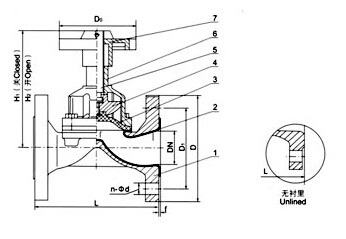 部件列表:1.閥體 2.閥體襯里 3.隔膜 4.閥瓣 5.閥桿 6.閥蓋 7、手輪